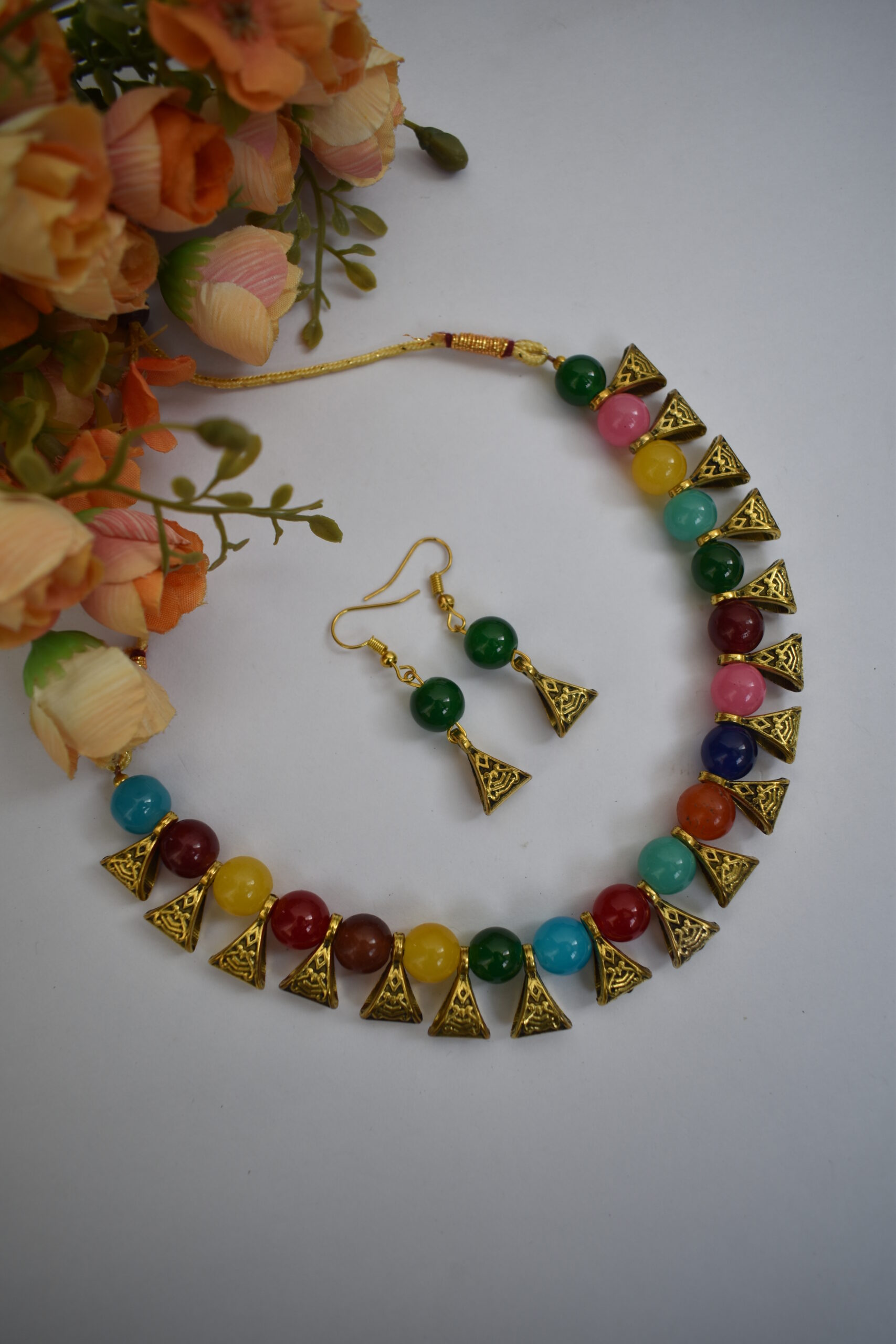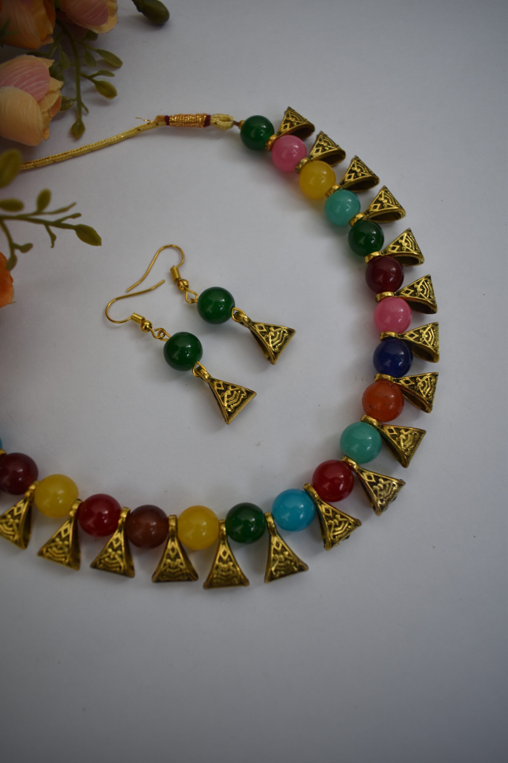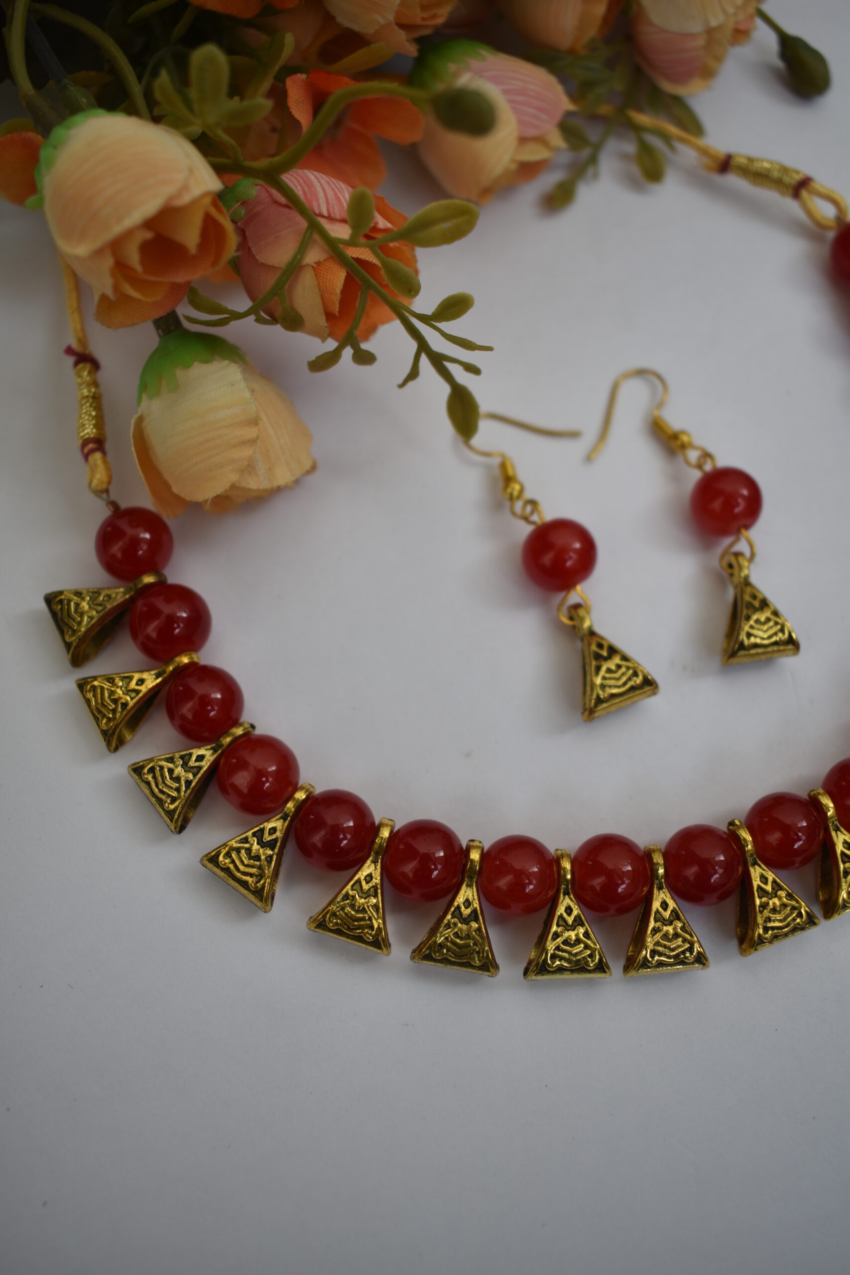 Antique beads, always a popular choice among jewelry lovers, have never looked better than they do in this set. With the addition of a beautiful oxidised finish, these beads are an attractive addition to any jewelry collection. This jewellery set has an antique feel, which adds a charming feel to any outfit. The combination of warm shades and beautiful designs is an attractive choice for everyday wear. This stylish set is sure to take you from day to night in style.