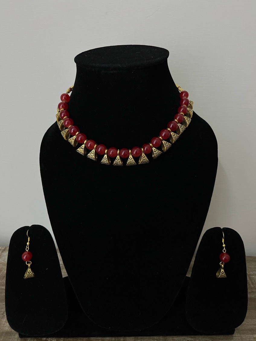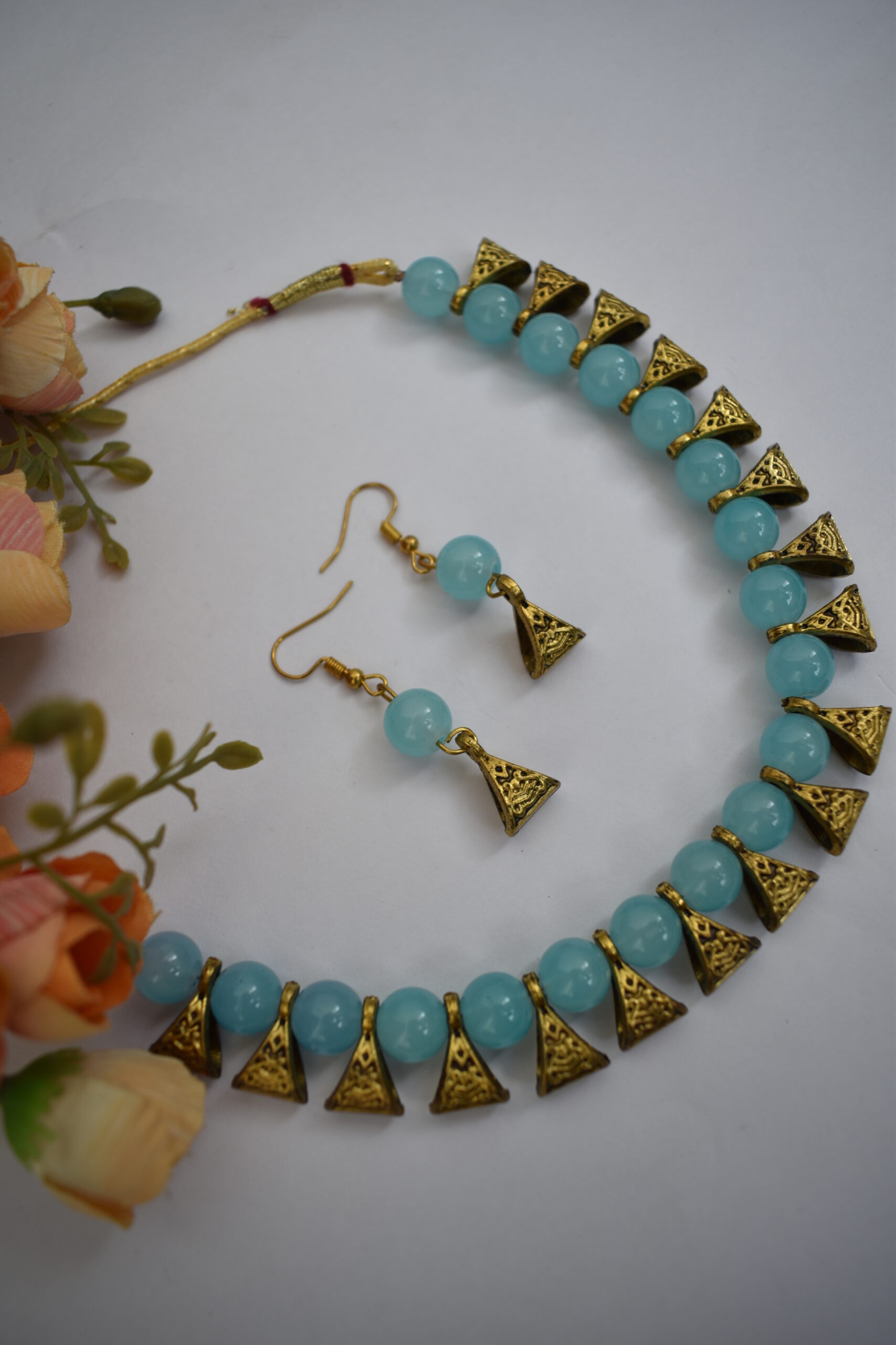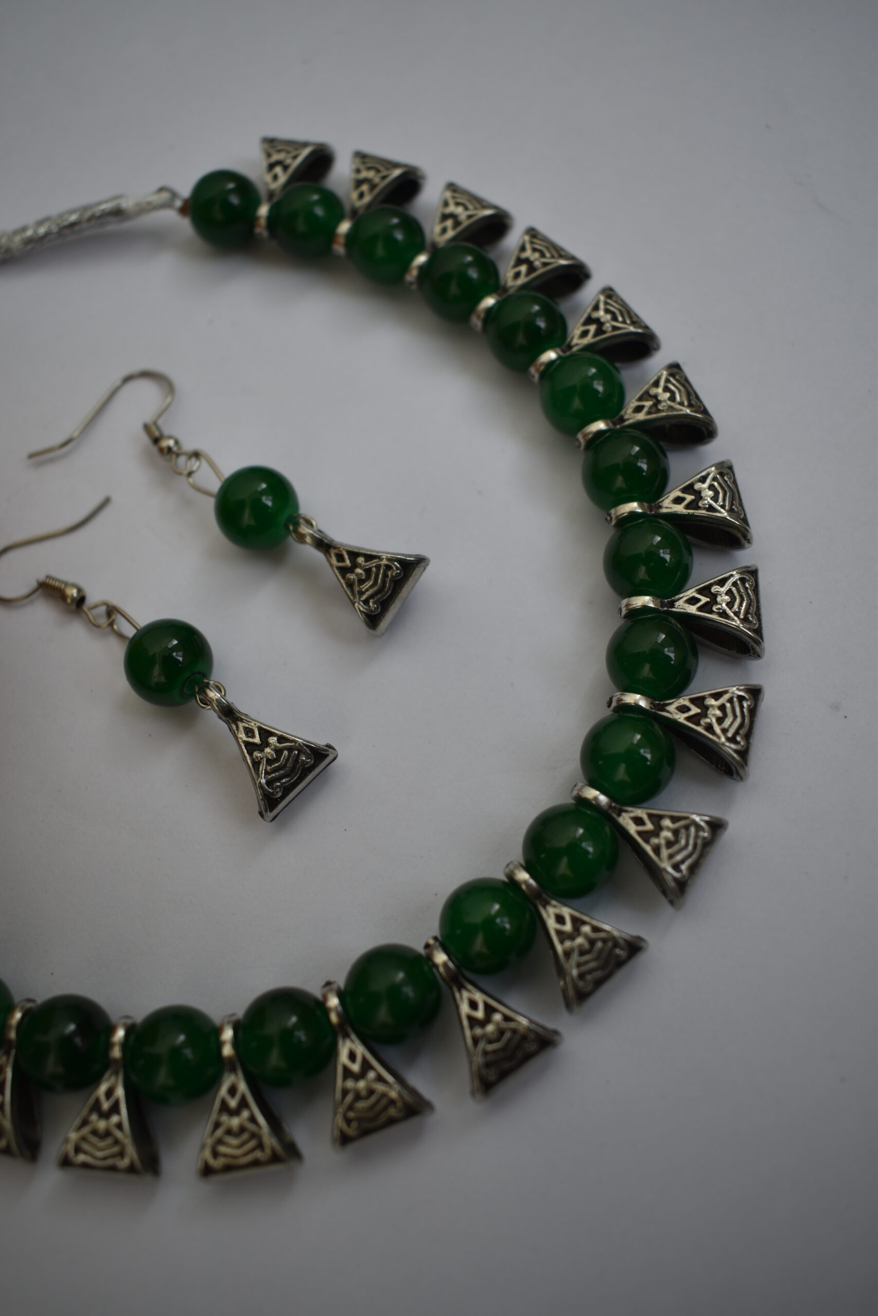 Antique beads, always a popular choice among jewelry lovers, have never looked better than they do in this set. With the addition of a beautiful oxidised finish, these beads are an attractive addition to any jewelry collection. This jewellery set has an antique feel, which adds a charming feel to any outfit. The combination of warm shades and beautiful designs is an attractive choice for everyday wear. This stylish set is sure to take you from day to night in style.