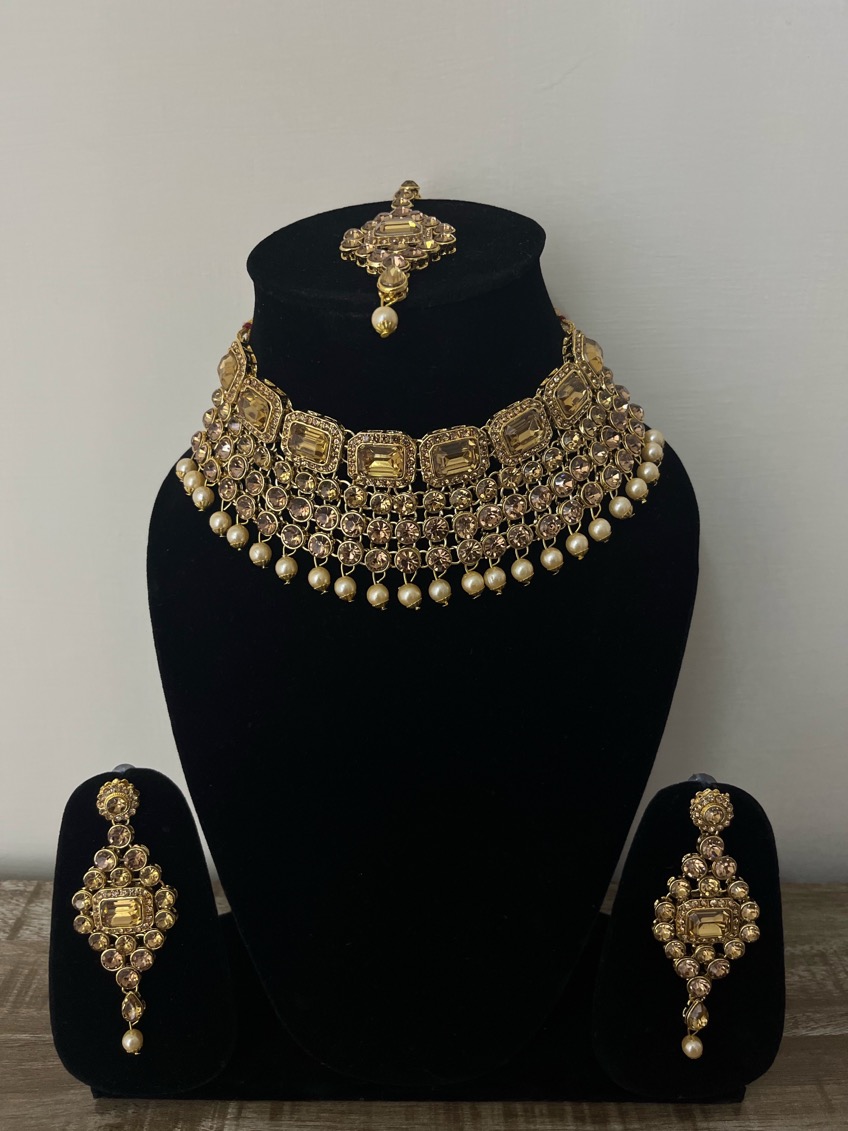 Add grace and charm to your appearance in this Beautiful Gold Toned Shimmery Choker Necklace Set for women and girls. Pair up with ethnic attire. Ideal for festivals, wedding, parties and social get together. This beautiful set will give an elegant look. Buy this now before the stock ends.