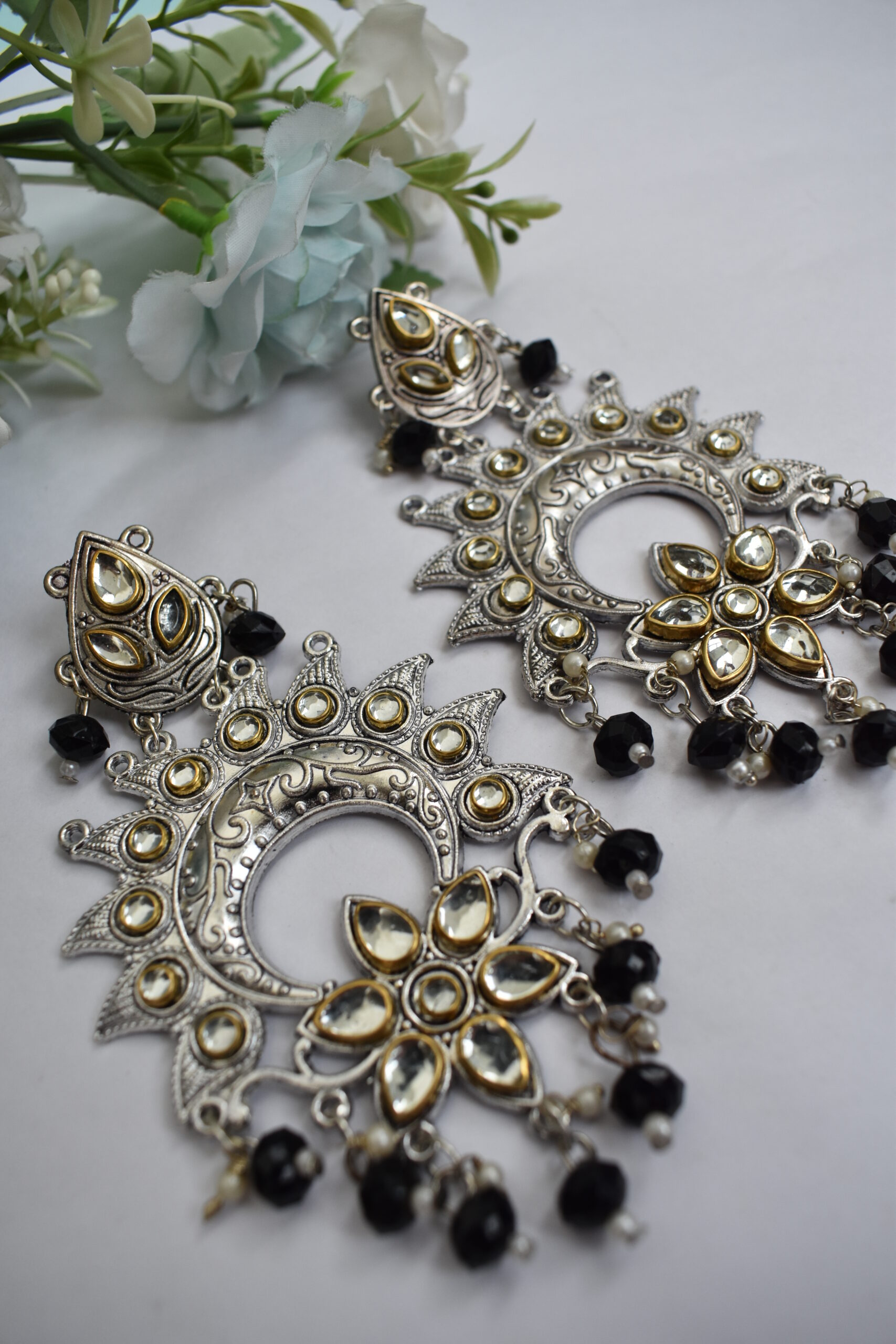Make a graceful style statement with the Beautiful Oxidised German Silver Chandbali Earrings, a true reflection of heritage and craftsmanship. Featuring the iconic crescent-shaped Chandbali design, these earrings are crafted from high-quality oxidised German silver, giving them an antique finish that complements both festive and everyday traditional outfits.