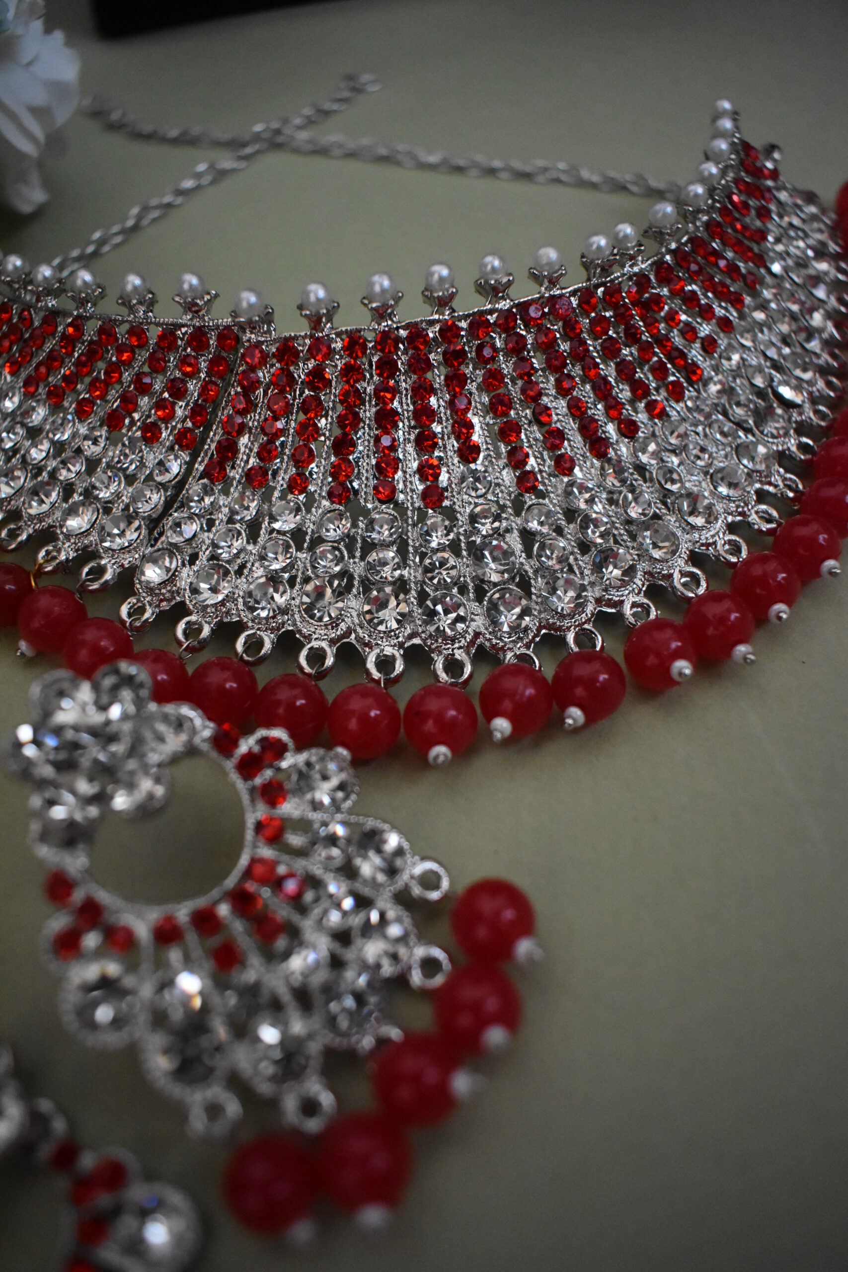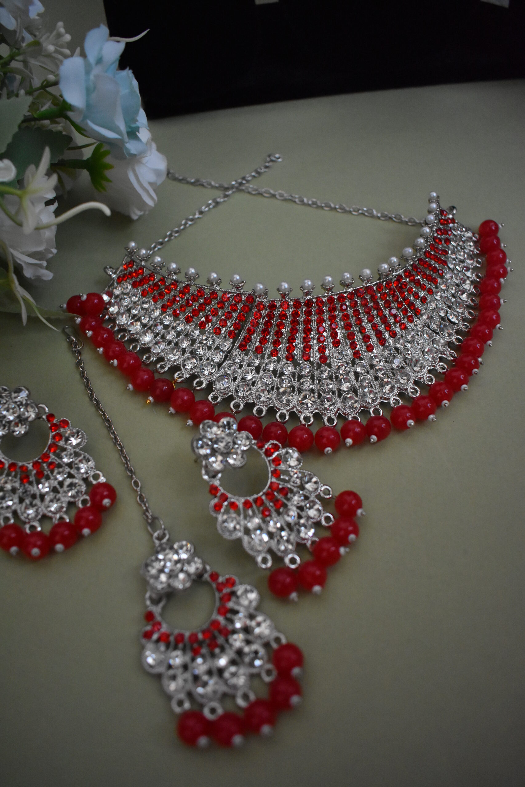 The set includes a matching pair of earrings, echoing the same elegance as the necklace. Crafted from skin-safe, lightweight materials, it ensures comfort and durability for all-day wear. The secure closures provide a snug fit while maintaining a graceful drape across the neckline.